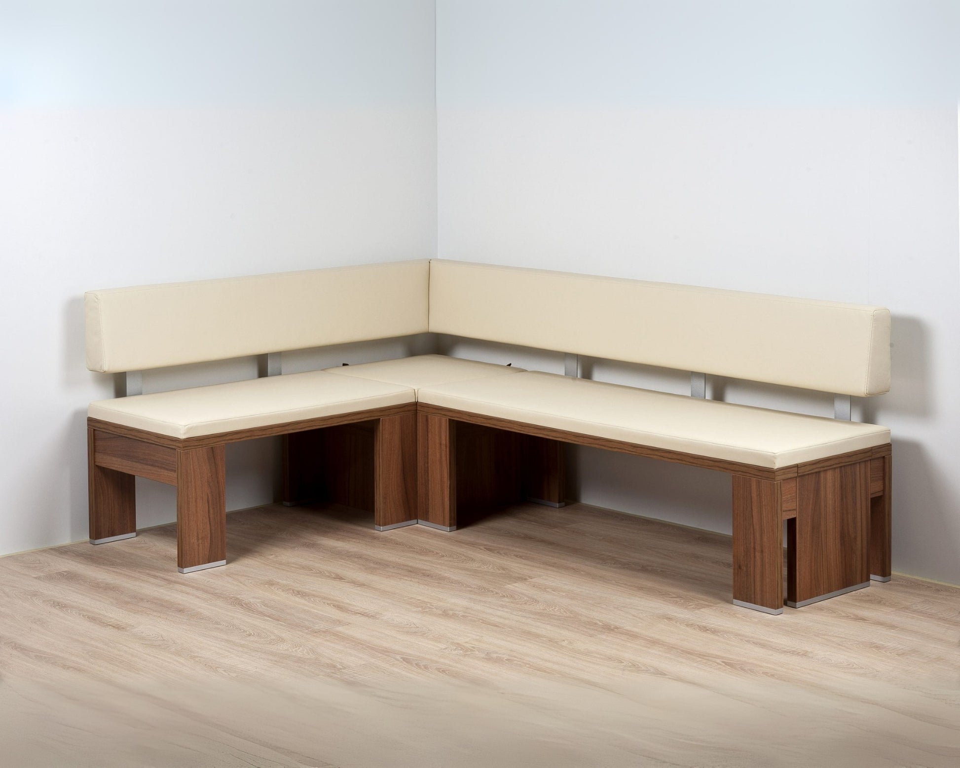 Kotna klop po naročilu s tapeciranim sediščem in naslonom. Klop ima v kotu shranjevalni boks. V primeru, da je klop s podaljšanjem, je boks namenjen shranjevanju dodatnega sedišča.