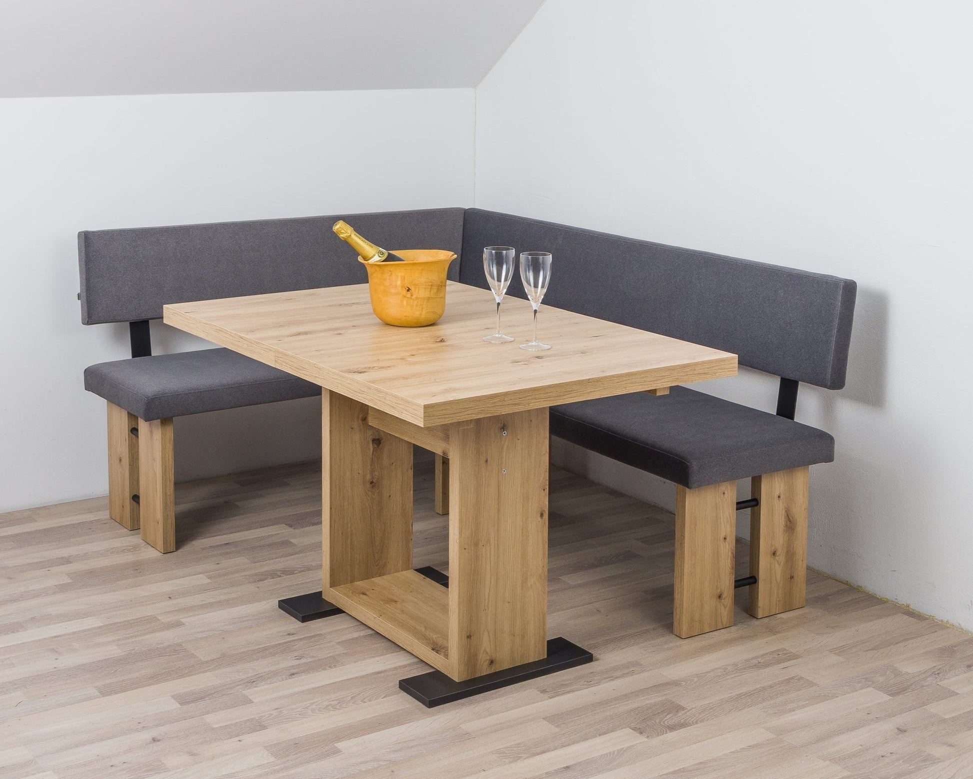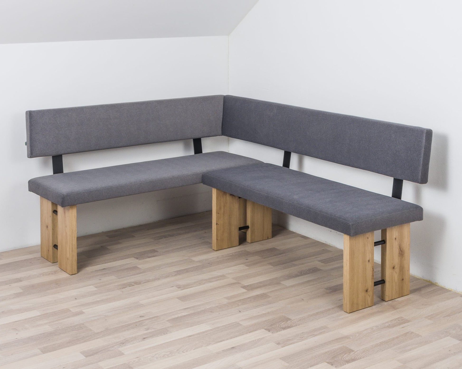 Kotna klop po naročilu s tapeciranim sediščem in naslonom in štirimi različnimi modeli nog.