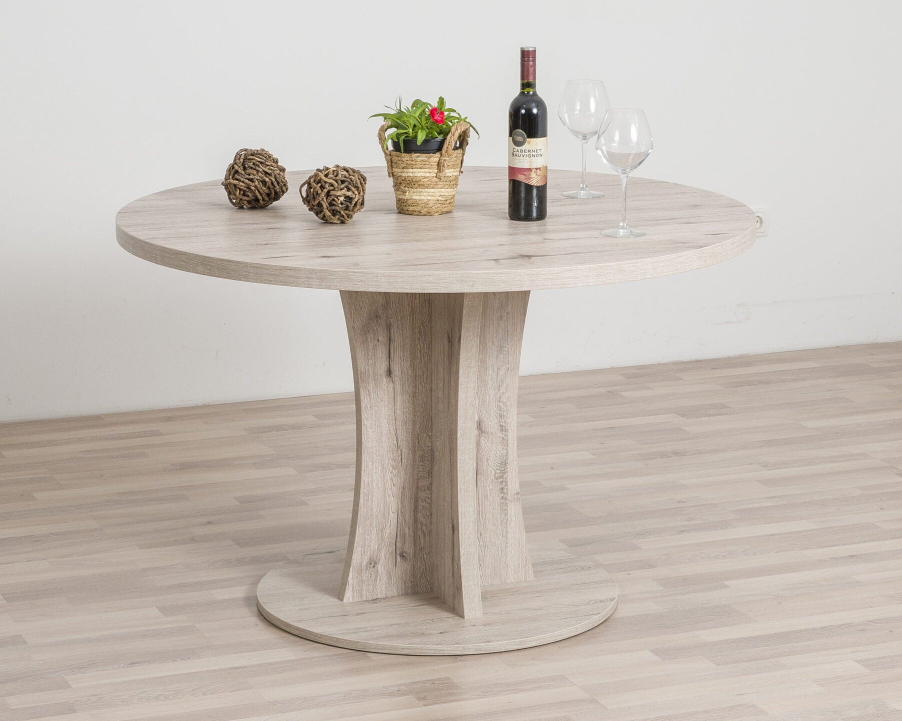 Okrogla miza s premerom 1200 mm in centralno nogo. Talna plošča je lahko v dekorju mize ali črnem dekorju.