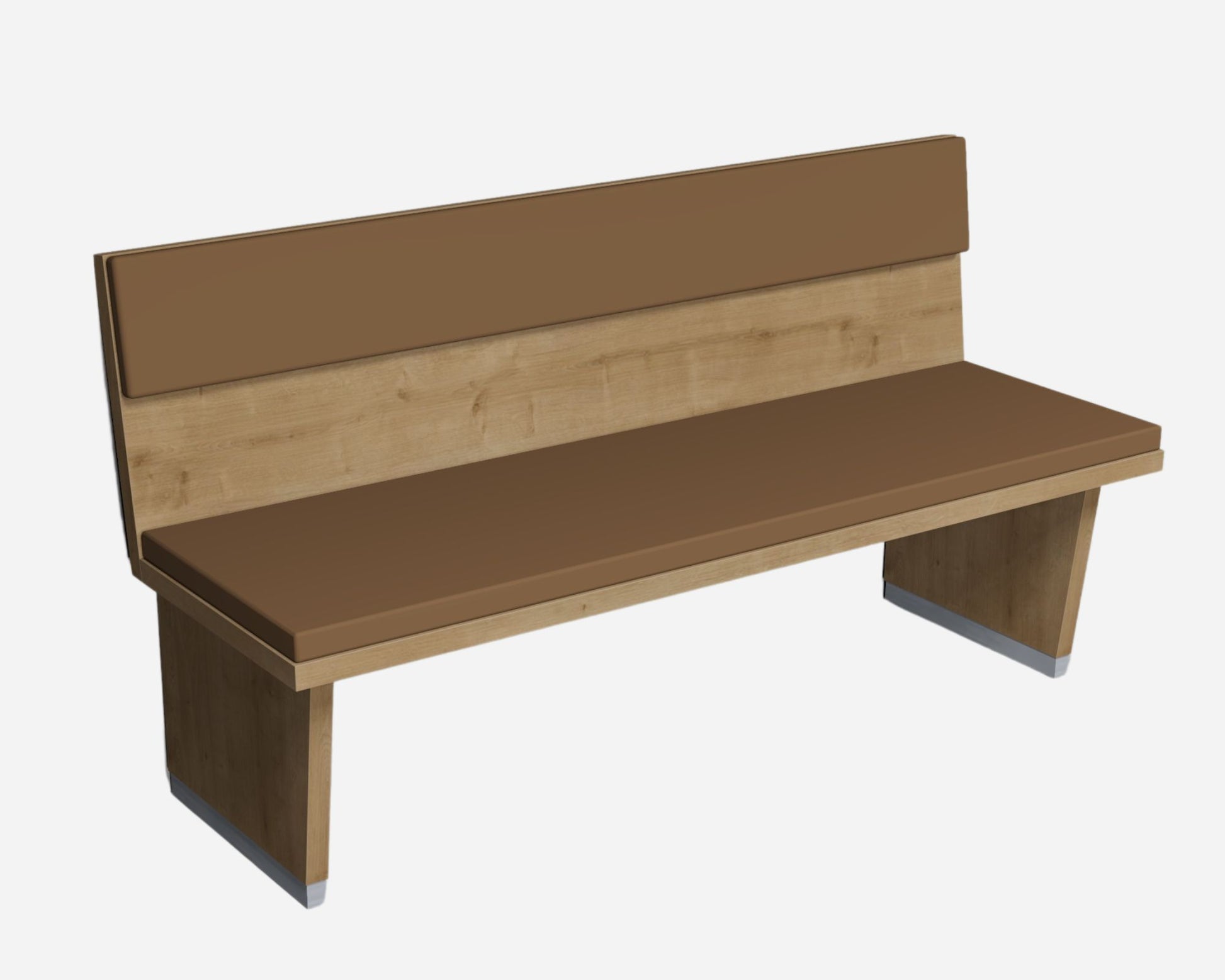 Ravna klop po naročilu s tapeciranim sediščem in naslonom. Na voljo sta dva načina tapeciranja (klasično in s šivanimi robovi). Pri klasičnem tapeciranju so zunanji vogali sedišča lahko ravni ali zaokroženi. Noge imajo lahko talne letve v inoxu, črne, lahko pa so tudi brez letev.