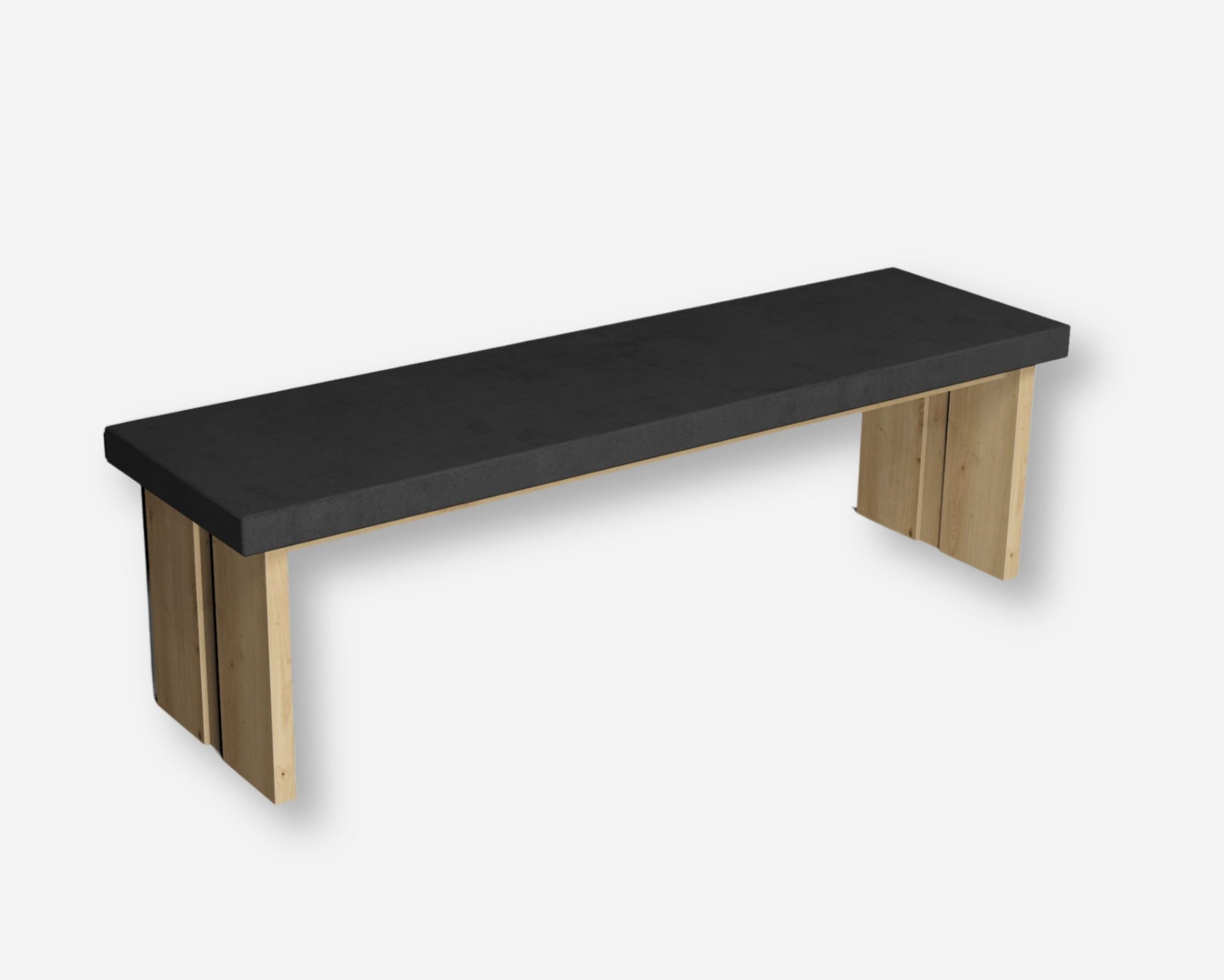 Ravna klop po naročilu s tapeciranim sediščem. Na voljo so različni dodatki (predal pod sediščem, dvižno sedišče z boksom za spravilo)