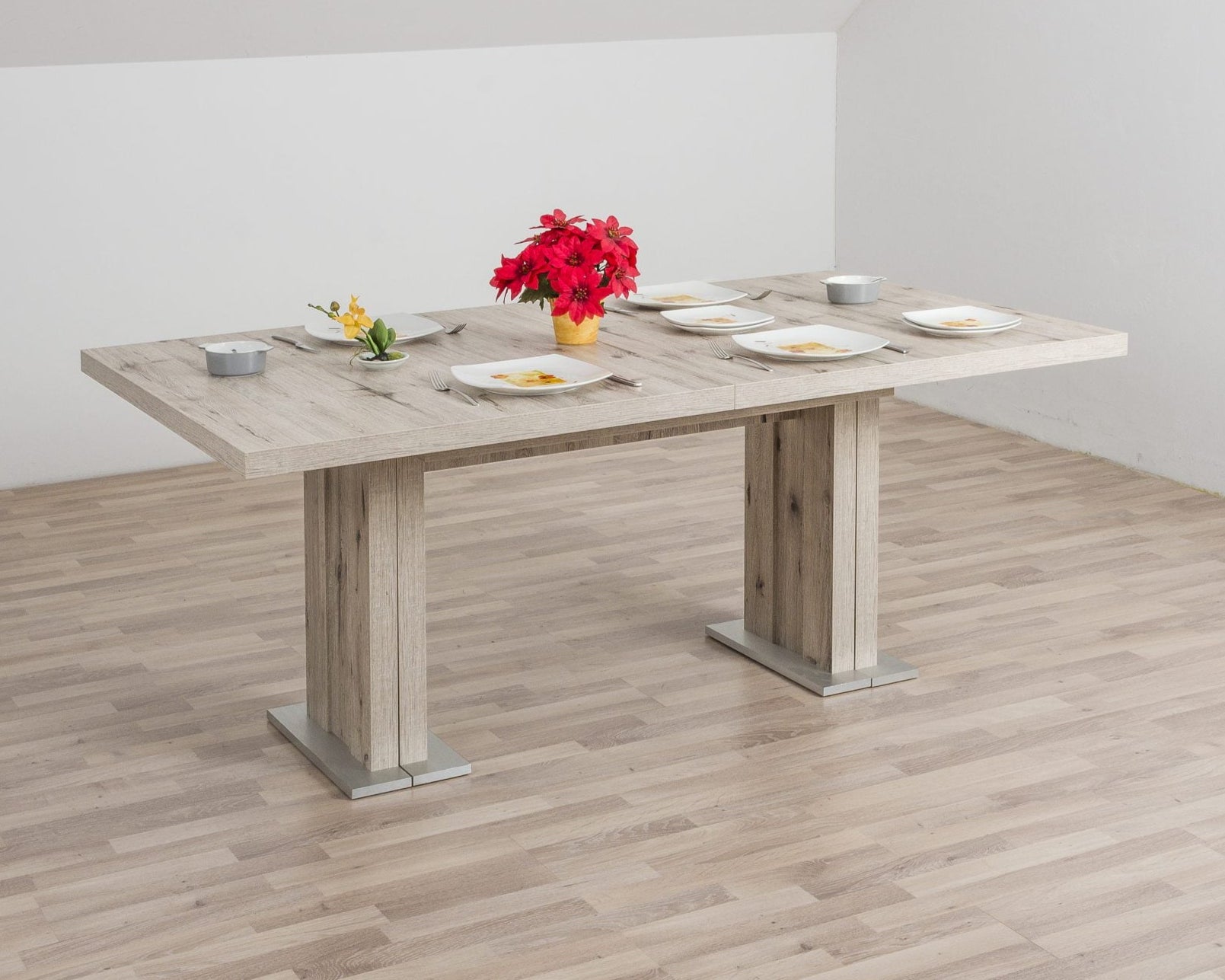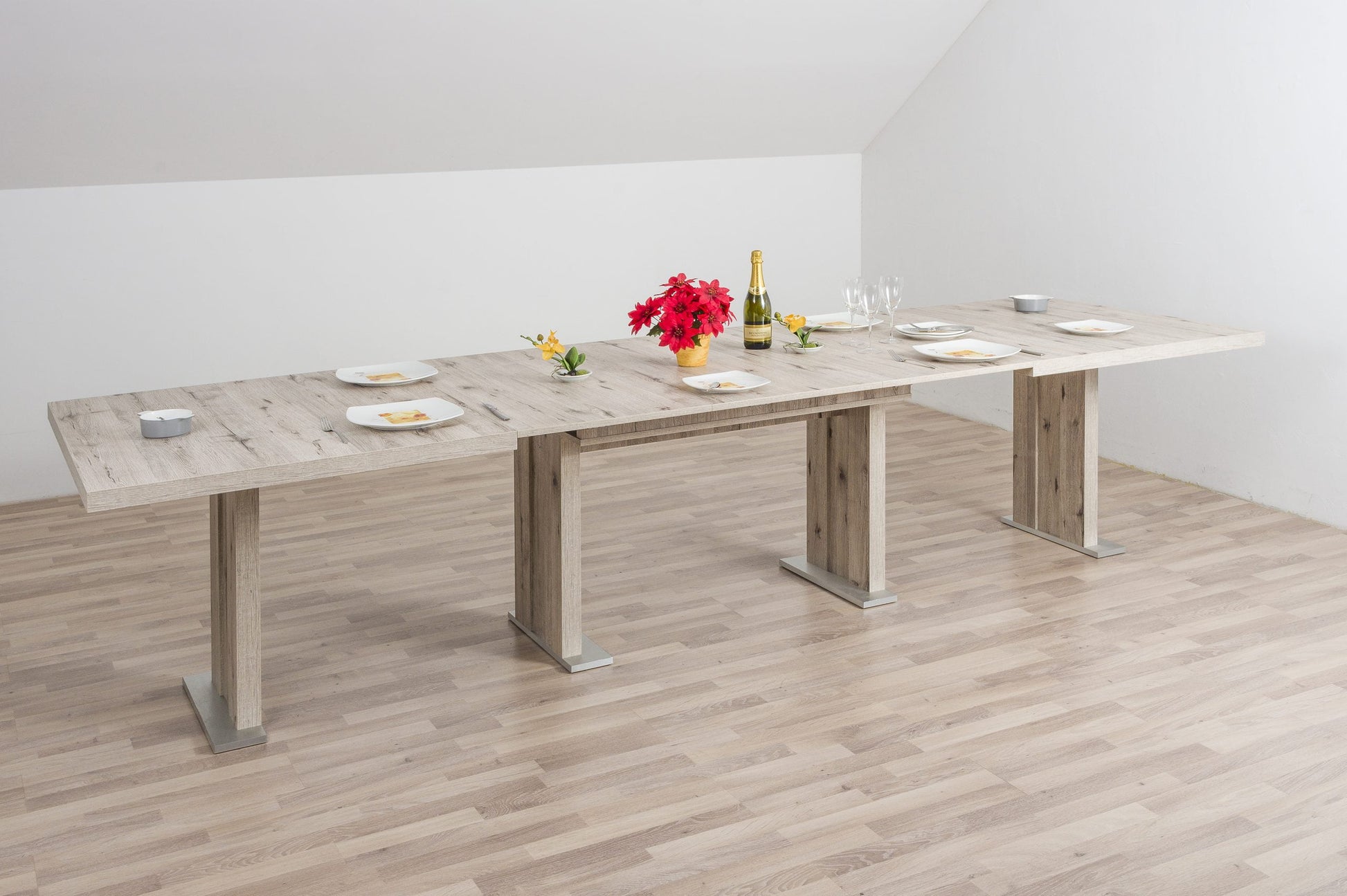 Raztegljiva miza s sredinskim podaljšanjem, ki s tremi podaljški do 50 cm podaljša osnovno dimenzijo mize za kar 150 cm. Zunanje podporne noge imajo vgrajena kolesca, ki skupaj s sinhronim vodilom omogočajo enostavno in hitro raztegovanje.